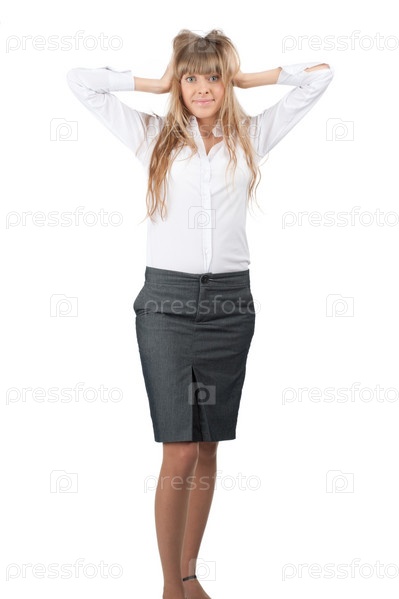 Взволнованная деловая женщина держится за голову. Изолировано на белом фоне