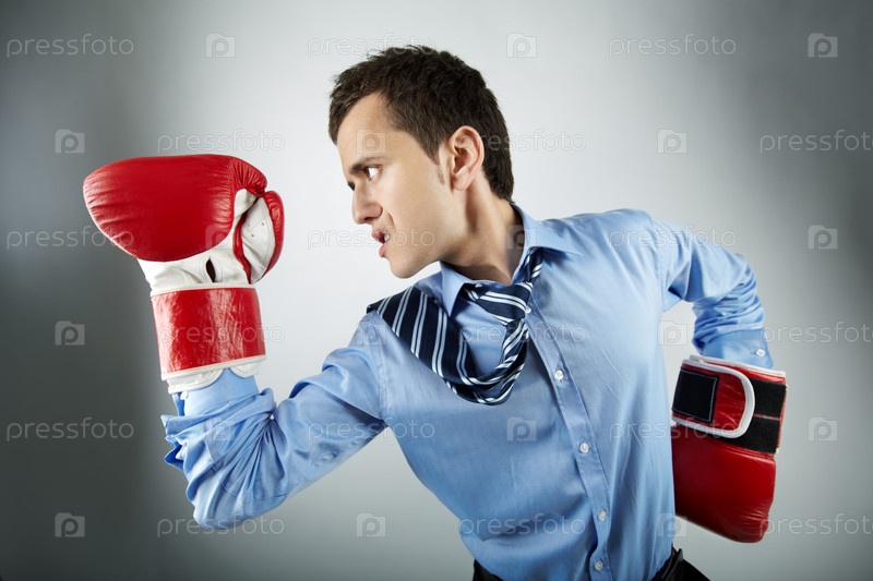 Деловой мужчина в боксерских перчатках, на сером фоне