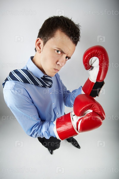 Деловой мужчина в боксерских перчатках на сером фоне