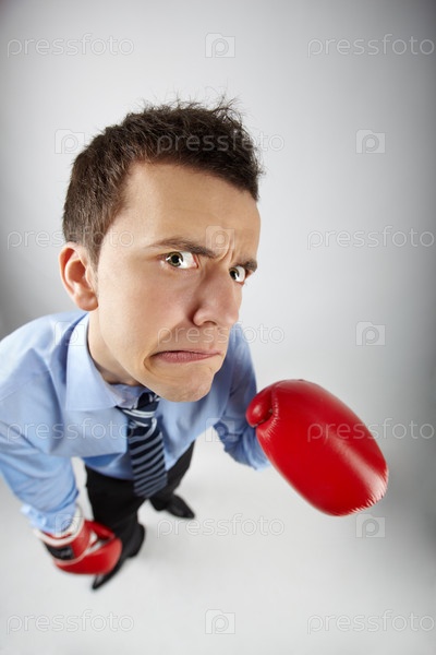 Испуганный деловой мужчина в боксерских перчатках на сером фоне