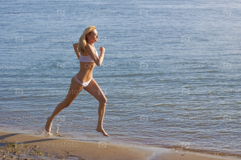 Спортивная девушка бежит по пляжу