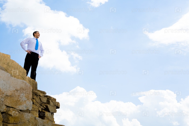 Фото счастливого бизнесмена, стоящего на обрыве и смотрящего вдаль на фоне яркого неба