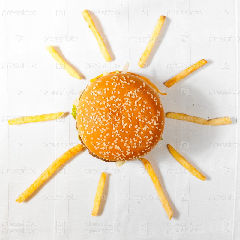 Солнышко из гамбургера и картофеля-фри на белом фоне