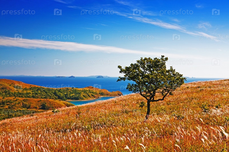 Дерево на берегу моря, осенний пейзаж