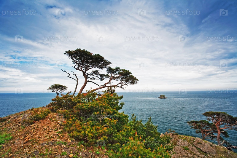 Деревья на берегу моря, осенний пейзаж