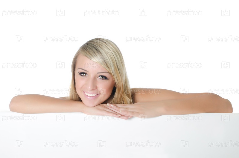 Портрет молодой женщины с пустым рекламным щитом, изолированной на белом