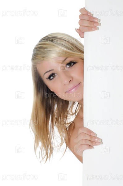 Портрет молодой женщины с пустым рекламным щитом, изолированной на белом