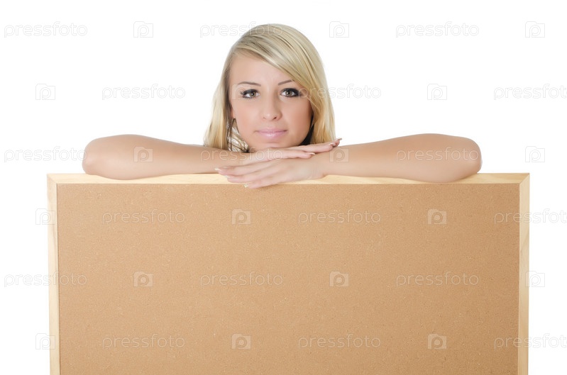 Портрет молодой женщины с пустым рекламным щитом, изолированной на белом