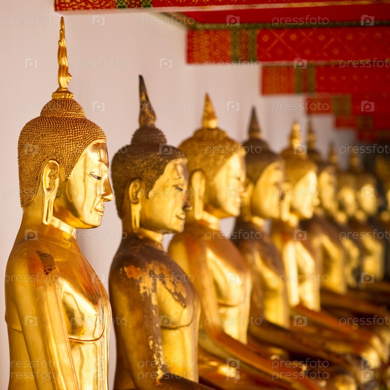 Золотоые статуи Будды в галерее буддистского храма Ват Пхо, Бангкок, Таиланд