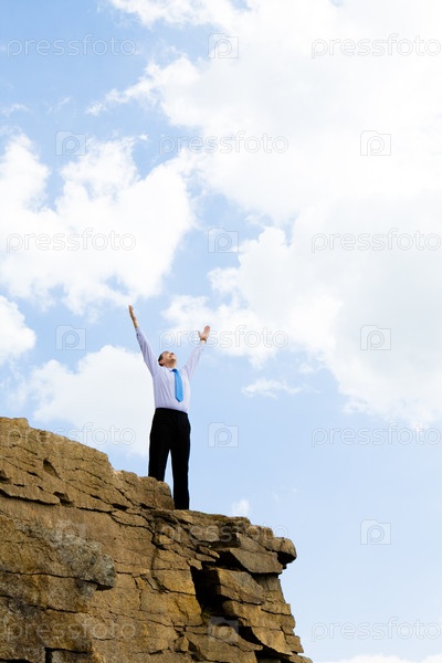 Изображение веселого бизнесмена, поднимающего руки вверх к яркому голубому небу на открытом воздухе