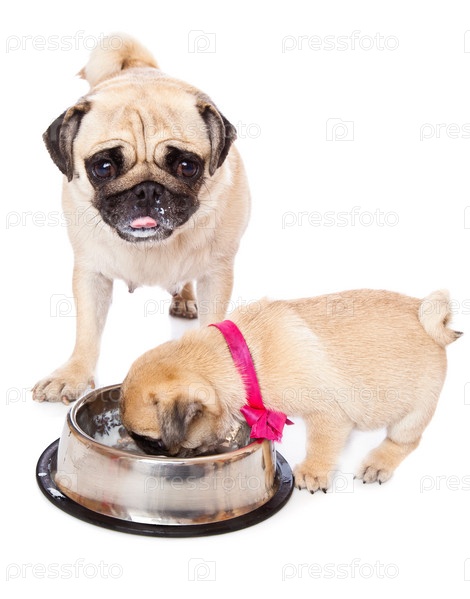 Щенки мопса пьют молоко. Изолированы на белом фоне