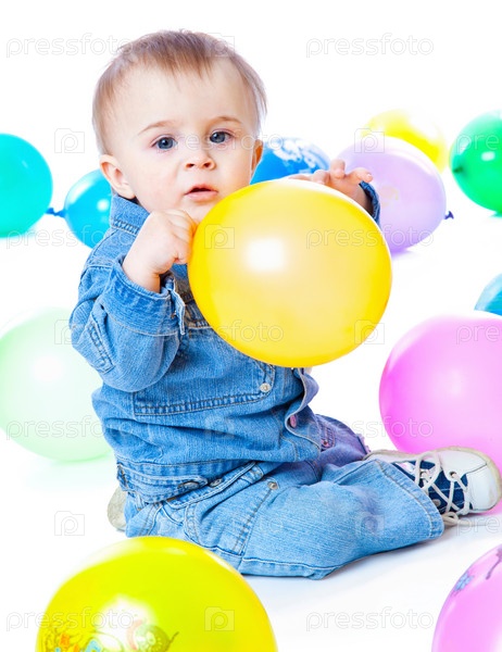 Ребенок с воздушными шарами. Изолирован на белом фоне