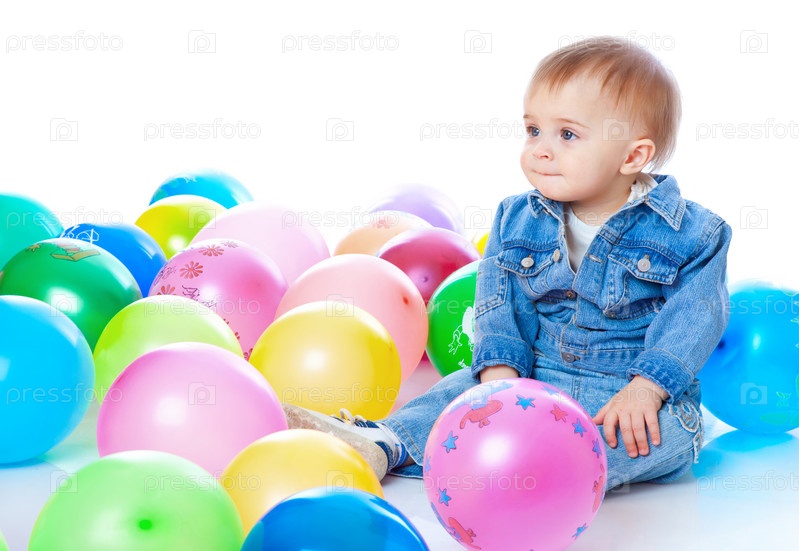 Ребенок с воздушными шарами. Изолирован на белом фоне