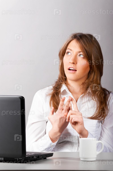 Деловая девушка считает в офисе, сидя перед ноутбуком с чашкой кофе