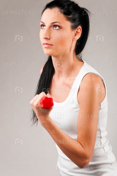 Спортивная девушка с гантелями на сером фоне
