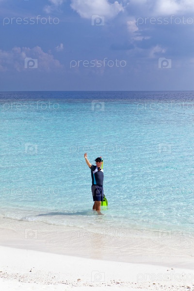 Молодой мужчина с ластами, маской и трубкой позирует на фоне океана