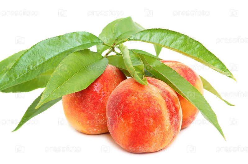 Зрелые сочные персики стоят с листьями на белом фоне