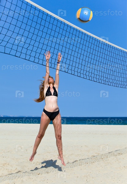 Привлекательная женщина играет в пляжный волейбол