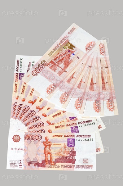 Пятитысячные купюры на сером фоне