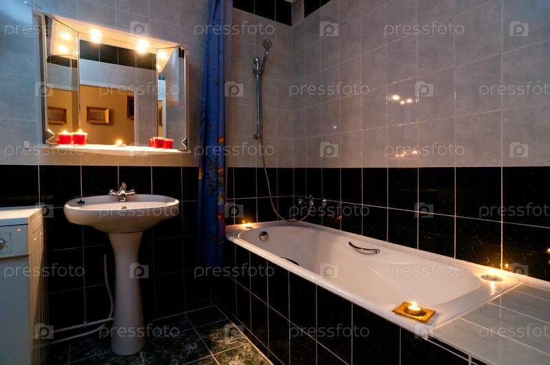 Интерьер ванной комнаты в темноте с горящими свечами