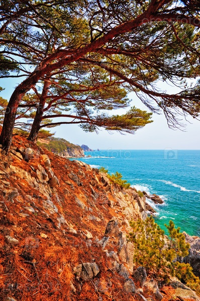 Хвойные деревья на скалистом берегу моря