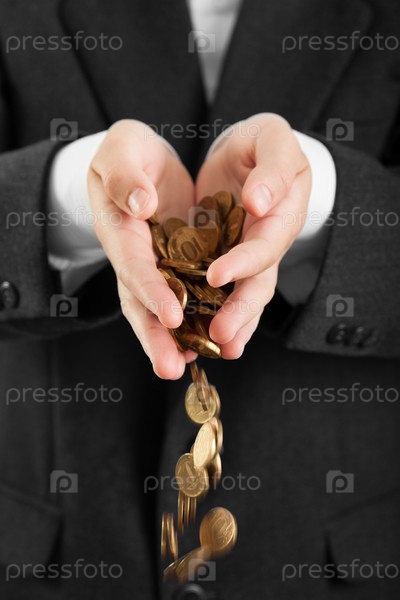 Крупным планом руки бизнесмена, из которых сыпятся монеты