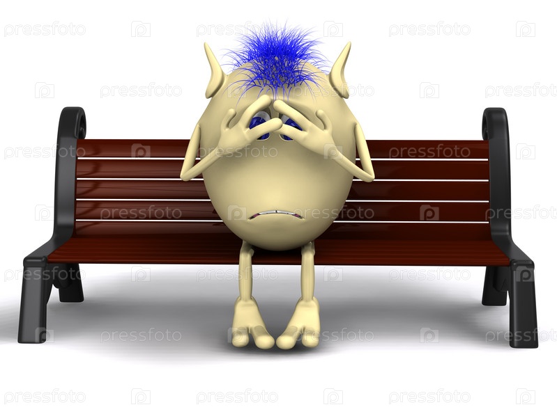 Кукольный персонаж стыдливо прикрывает лицо, сидя на лавочке