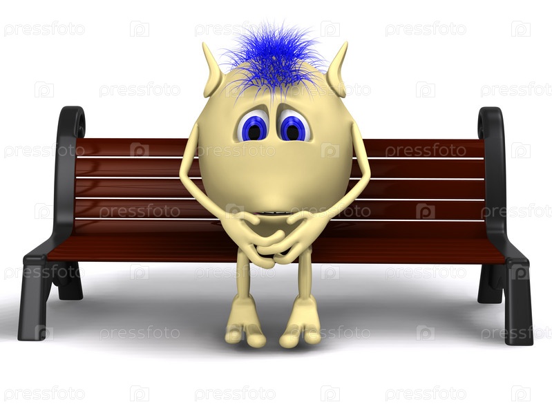 Кукольный персонаж размышляет, сидя на лавочке