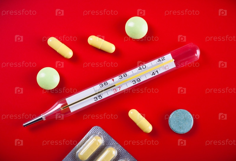 Термометр показывает опасную температуру и таблетки на красном фоне