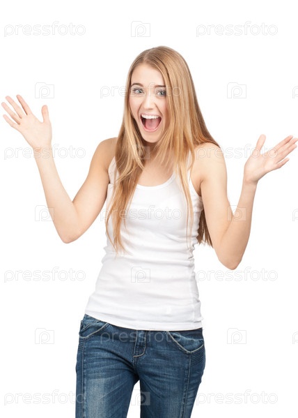 Портрет взволнованной девушки с открытым ртом. Изолировано на белом фоне