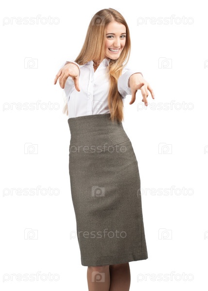 Портрет привлекательной деловой женщины, указывающей пальцем на зрителя, изолировано на белом