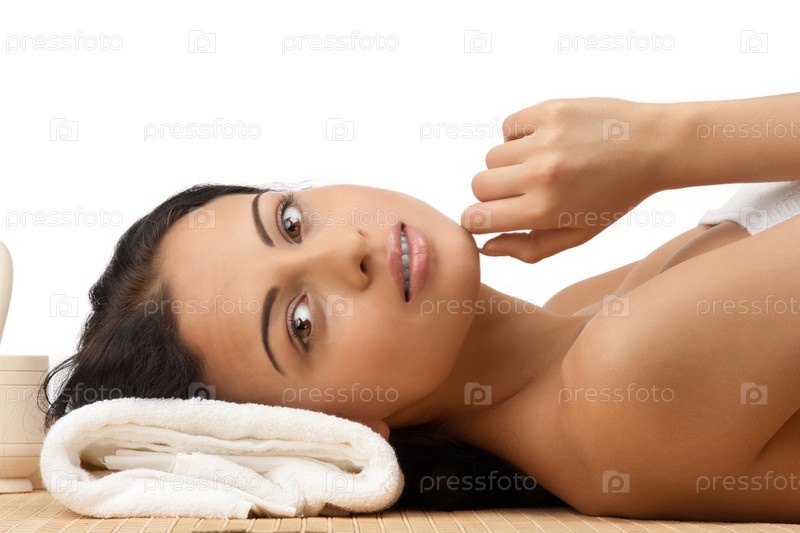 Девушка принимает процедуры в спа-салоне. Изолированная на белом фоне