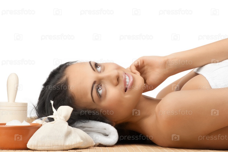 Девушка принимает процедуры в спа-салоне. Изолировано на белом фоне