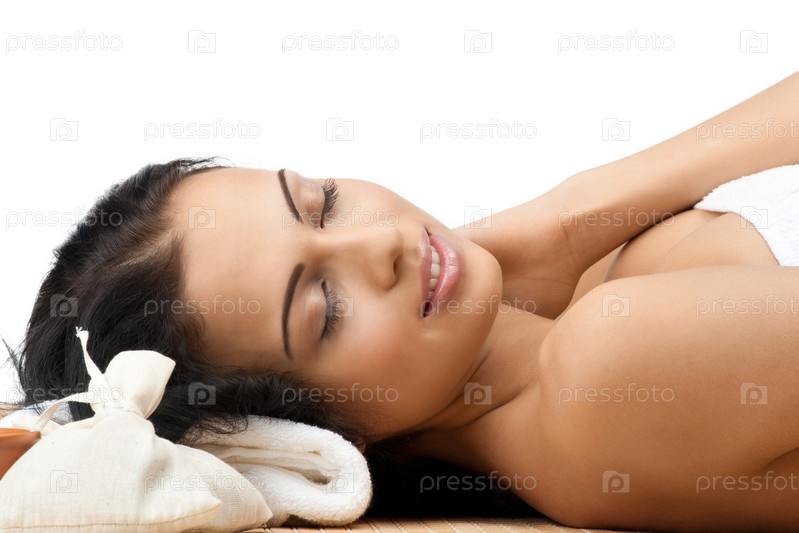 Девушка принимает процедуры в спа-салоне. Изолировано на белом фоне