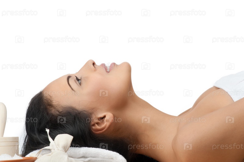 Девушка принимает процедуры в спа-салоне. Изолировано на белом фоне