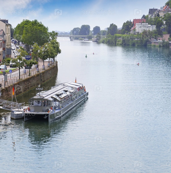Прогулочное судно на реке у городской набережной