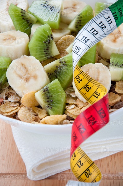 Тарелка мюсли со свежими фруктами и сантиметровая лента