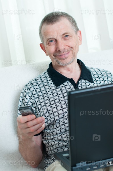 Пожилой мужчина звонит по мобильному телефону, сидя в гостиной с ноутбуком