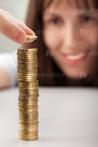 Женщина кладет монету на стопку монет