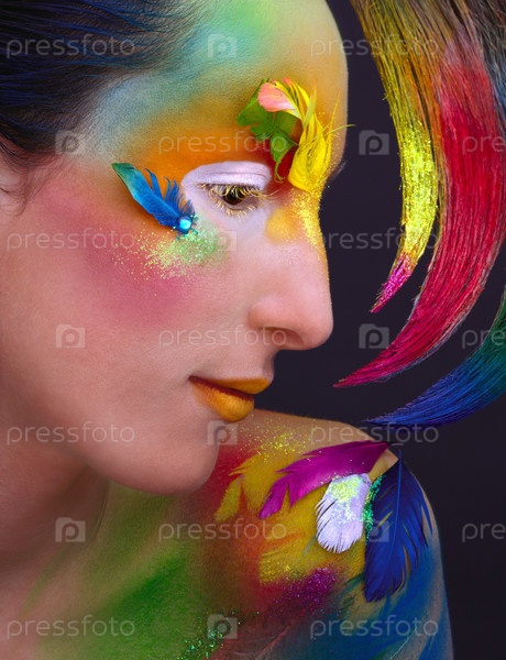 Портрет модели на темном фоне в образе попугая