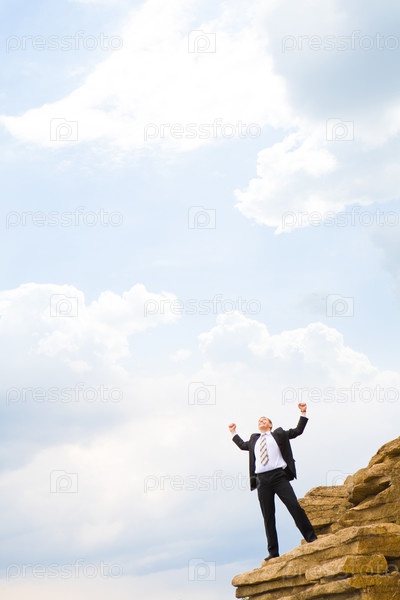 Вертикальное изображение счастливого бизнесмена, стоящего на скалах с поднятыми к небу руками