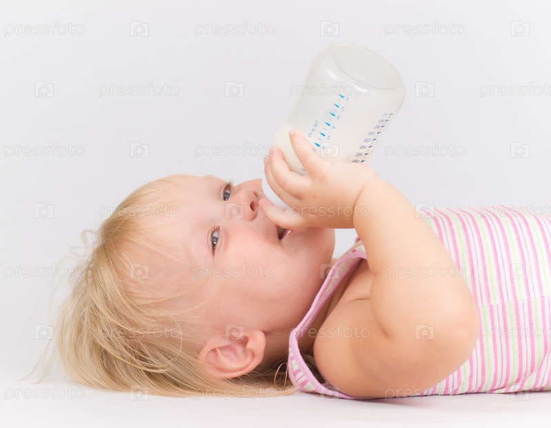 Очаровательный малыш пьет молоко из бутылочки, лежа на белом полу