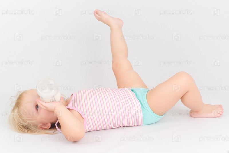 Очаровательный малыш пьет молоко из бутылочки, лежа на белом полу