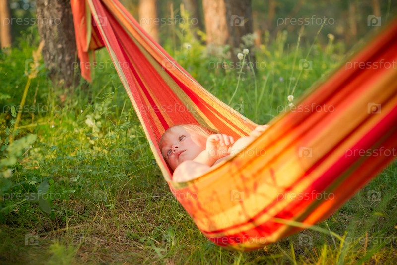 Маленькая девочка лежит в гамаке на природе