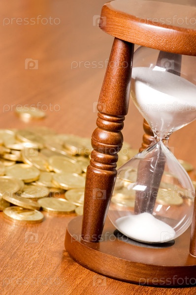 Песочные часы и монеты на деревянном столе