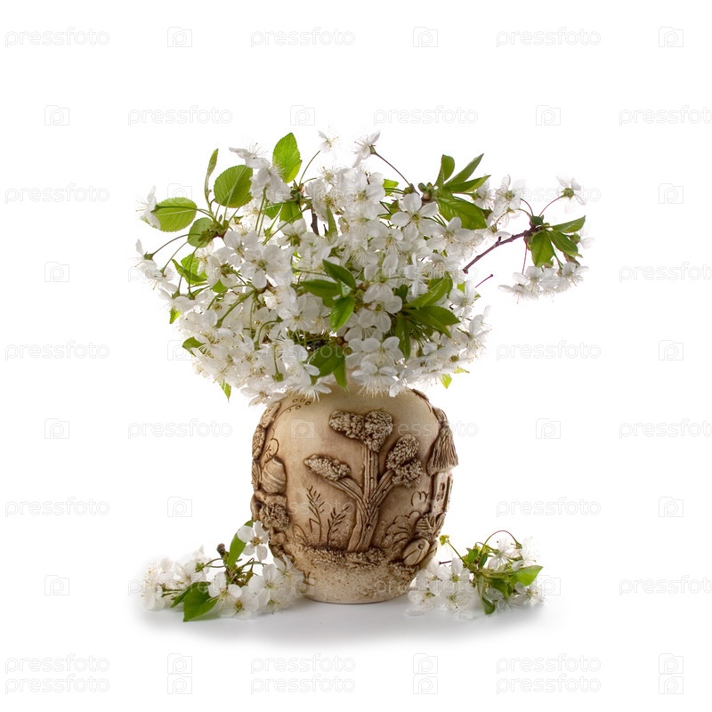 Букет цветущей яблони в вазе на белом фоне
