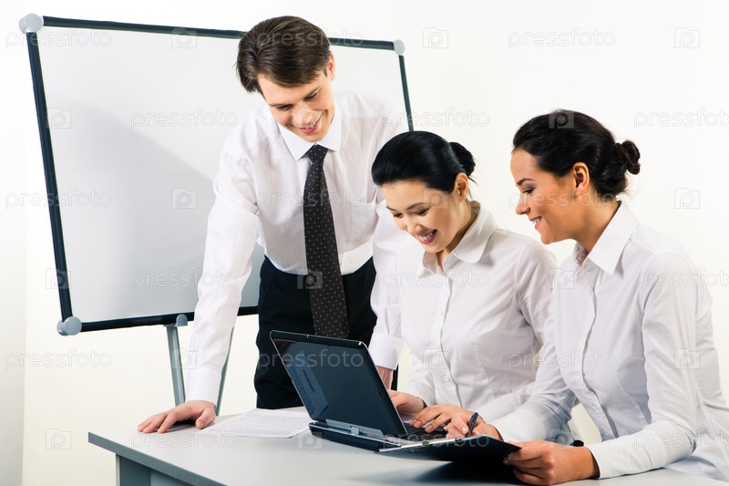 Фото уверенного бизнесмена, стоящего рядом с двумя красивыми женщинами, в то время как одна из них печатает на ноутбуке