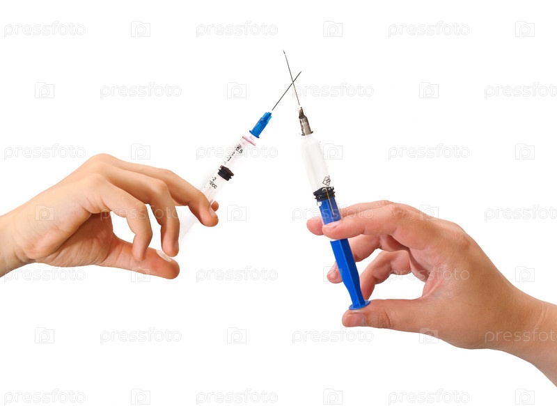 Две руки со шприцами. Изолированы на белом фоне