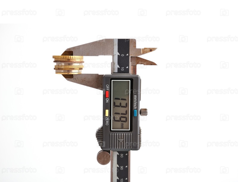 Электронный цифровой кронциркуль с денежными монетами на белом фоне
