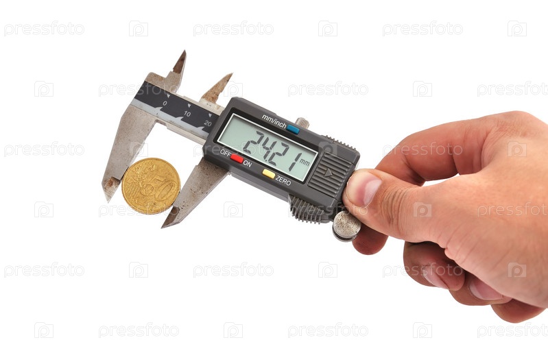 Электронный цифровой кронциркуль с монетой в руке на белом фоне